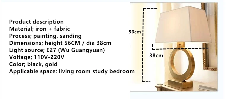 Voltage: AC110-220V Material: iron Color; black, gold Size: height 58cm / diameter 36cm Material: iron + PVC fabric Light source: E27 (not included) Applicable space: living room study bedroom