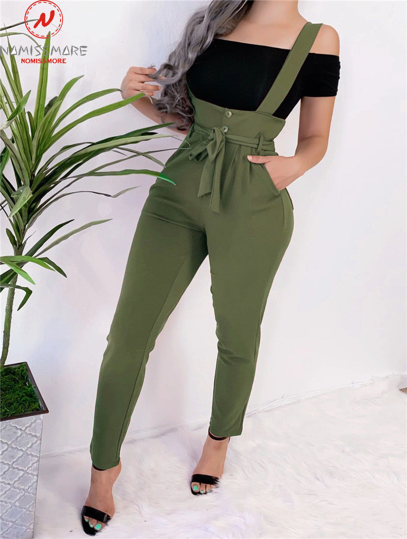 Women Streetwear Long Pants Bandage Design Button Pockets Decor High Waist Pencil Pants Lady Slim Hips Shoulder Straps Trousers
