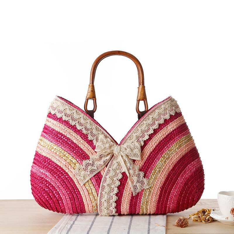 Fashion Bohemia Summer Women Lace Bow Straw Weave Rattan Handbag straw Beach Bag Woven Shoulder Tote Shopping Beach Bag