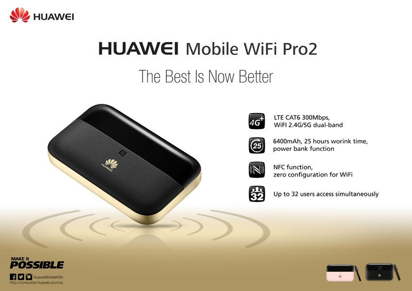 Global HUAWEI Mobile Wifi 2 Pro Router 4G+ Netwrok up to 300 Mbps Download Speed RJ45 USB 2.0 Ports Wi-Fi Dual band 2.4 GHz 5 GHz