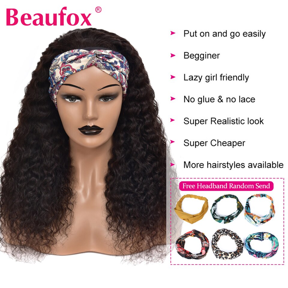 Beaufox Water Wave Headband Wig Human Hair Wigs For Black Women Brazilian Scarf Wig No GELGlueless Remy Curly Human Hair Wigs