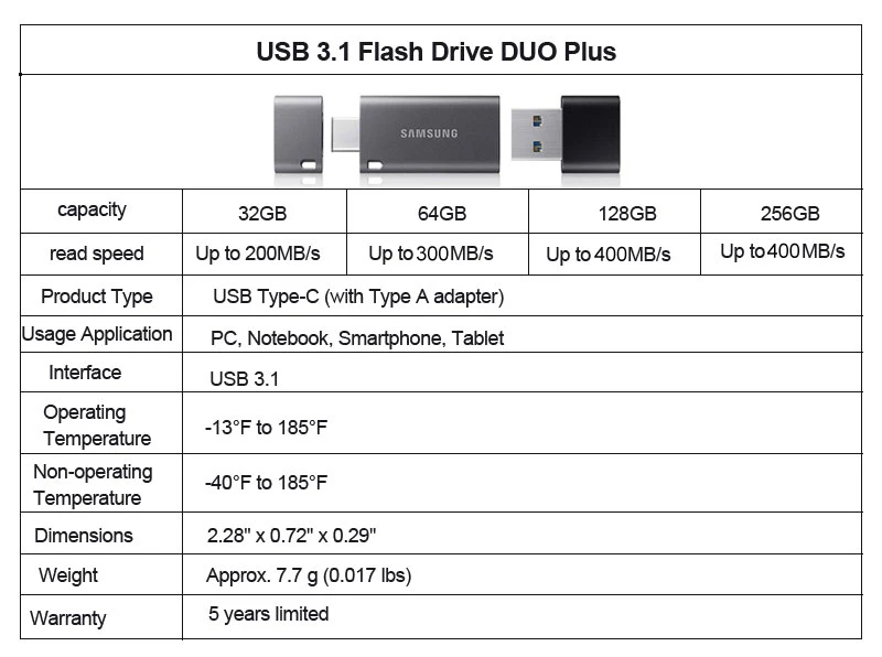 Samsung DUO Plus USB 3.1 Flash Drive 32GB 64GB 128GB 256GB Metal Type C Memory Stick Pendrive for smartphone tablet computer